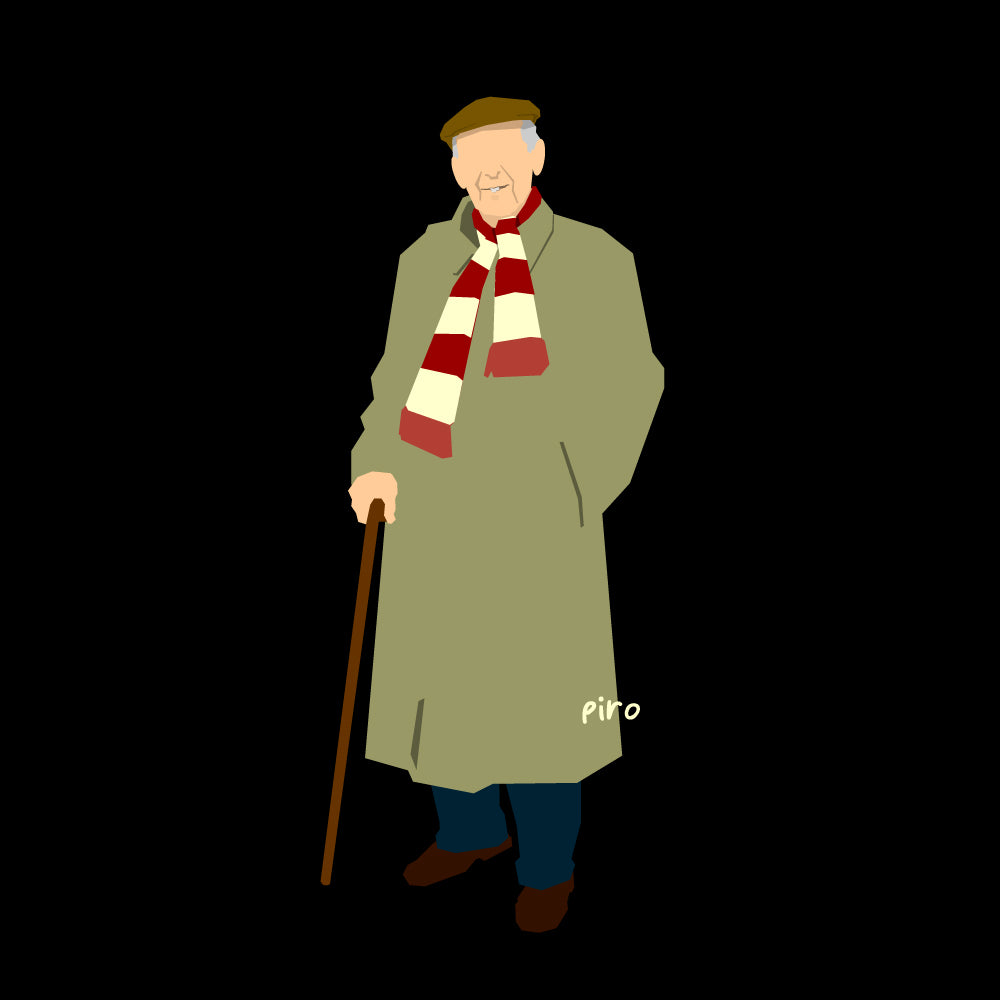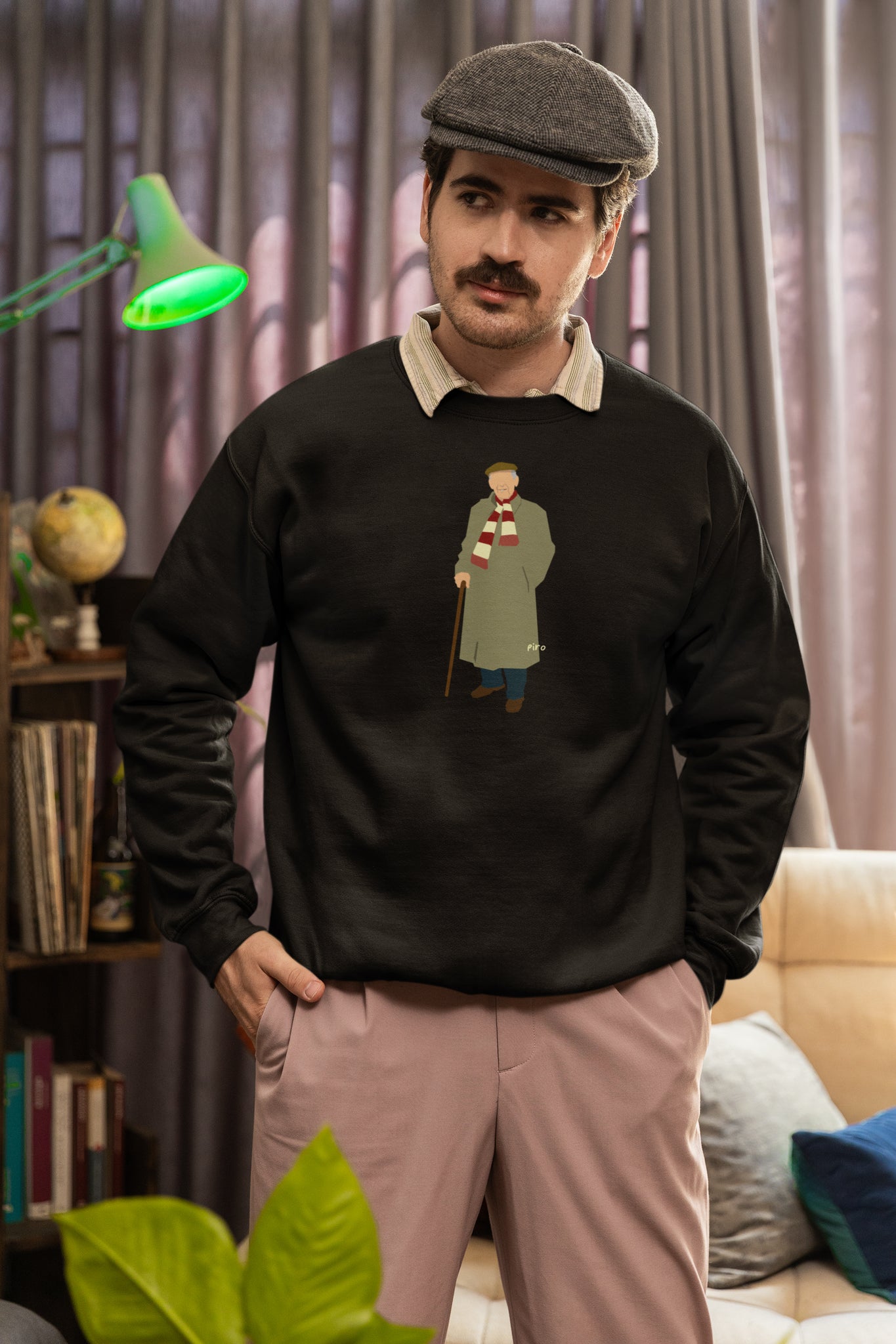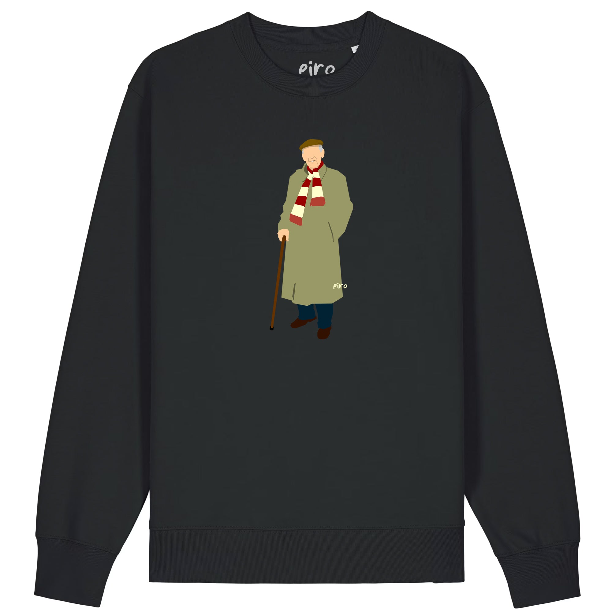 Meneer Frits op een zwarte crewneck...